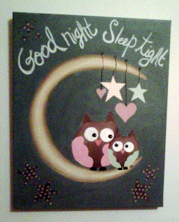 Another person asked me to do some nursery paintings and I was more than happy to do them! My friend said I could do whatever I wanted for one of them so I decided to do some cute owls and I actually used scrapbook paper for the wings and stars. I just cut out the shapes and applied them with mod podge. The top painting is definitely my favorite and I feel like Im going to do more like this. I never thought Id prefer to do kids paintings but now that Ive done a few Im starting to want to do more and more! Again, Im sorry for the horrible picture quality, I have yet to get a new camera so my crappy cell phone is going to have to work until then.